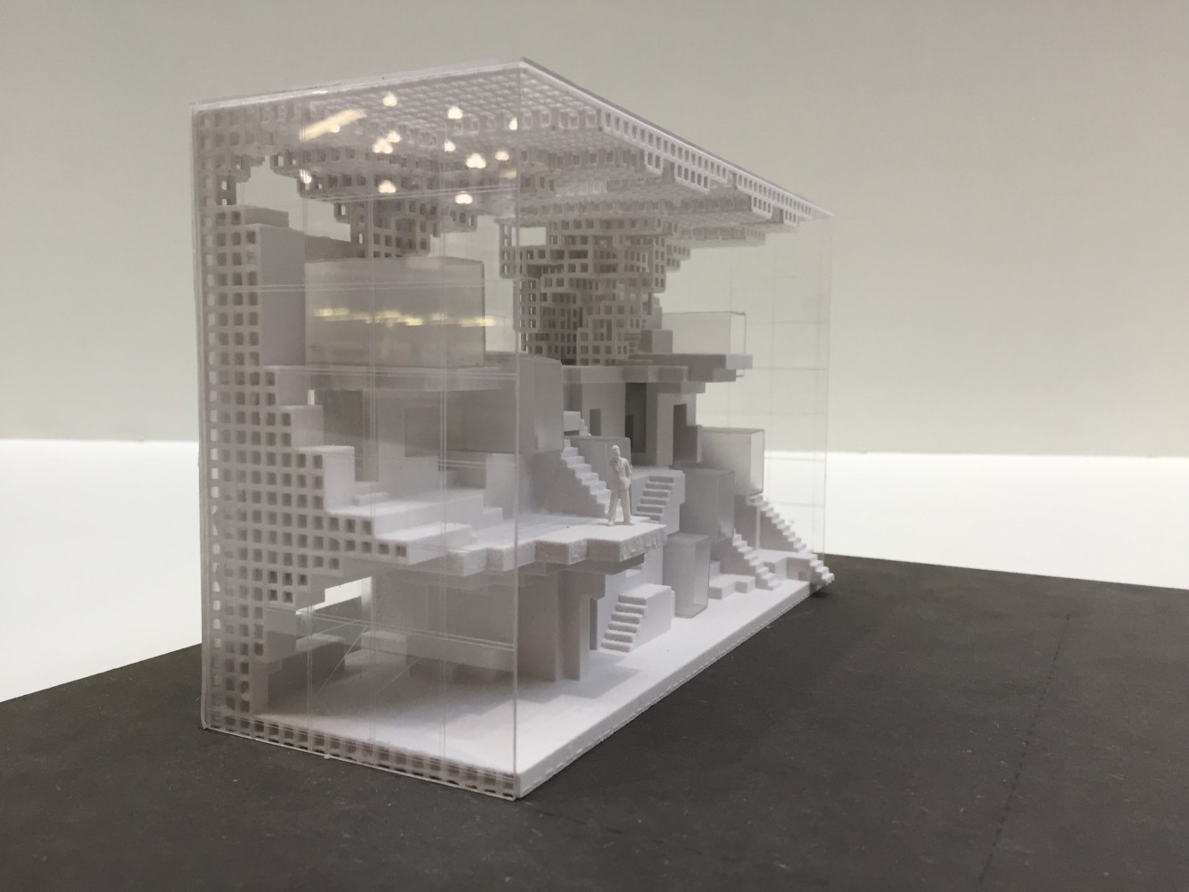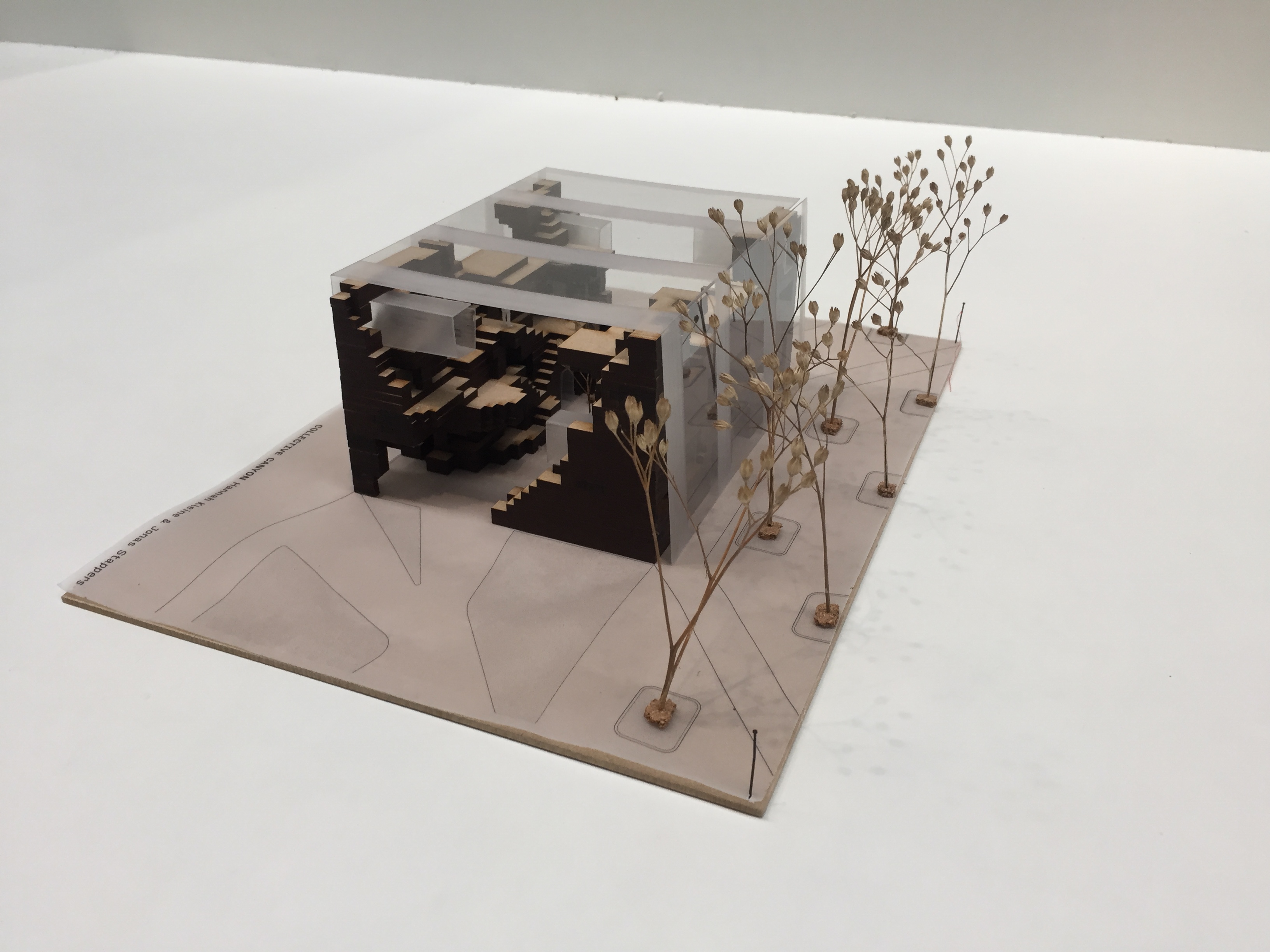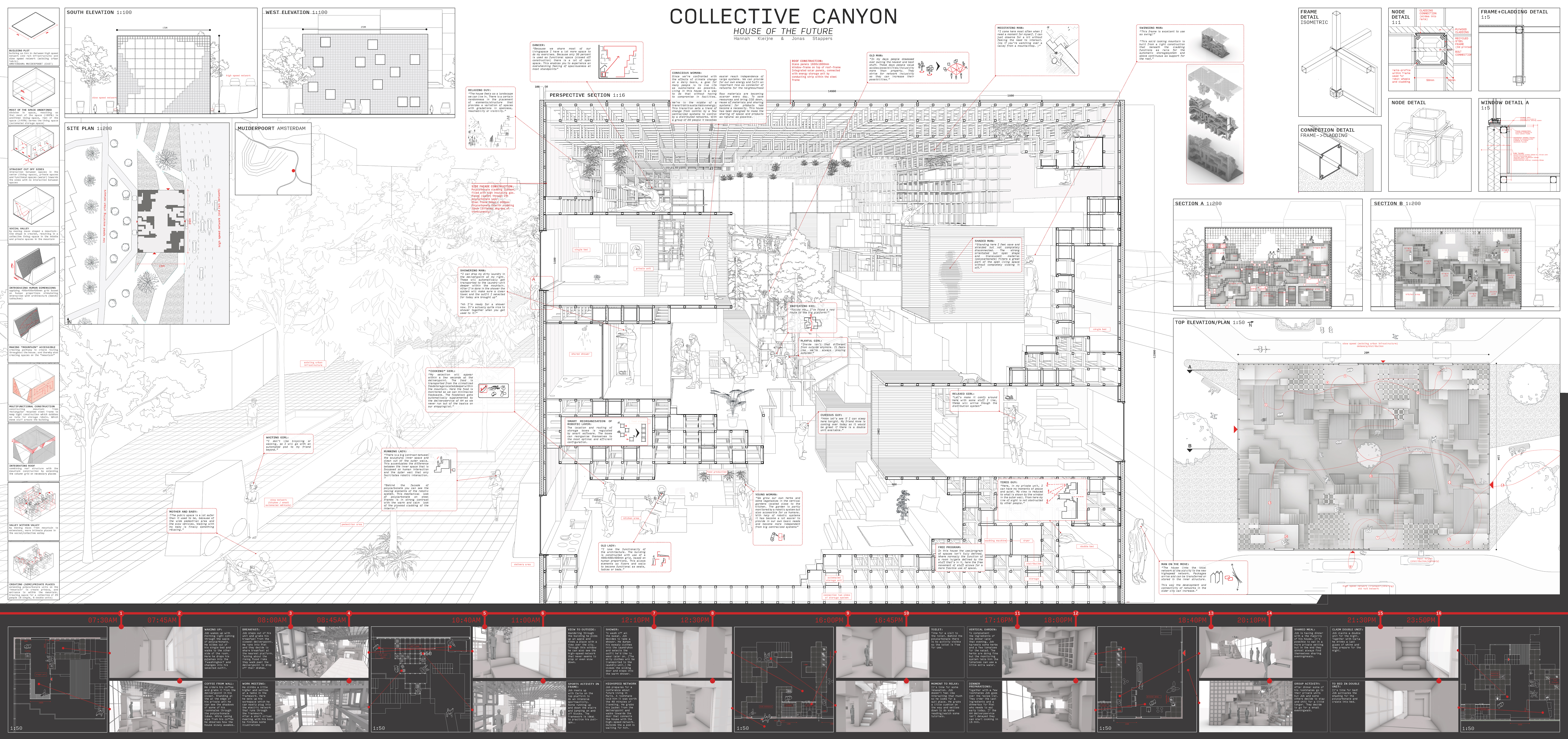 This project was part of the minor House of the future, where we were asked to design a custom future scenario (2050) and a corresponding house of the future. Within a world where living space and resources are becoming a lot more scarce, we designed a house where people could live and share stuff with each other. By using height and 3d-configuration we tried to design a house that exists of only one continues room but with a lot of different living atmospheres. We designed a structural typology which operates as construction, storage system and transportationsystem. This typology is modular and serves as carrier of the architectural cladding but also as storage system. This way the building functions also as transportation node in the urban setting, by connecting the existing neighbourhood to a new transportation system. To present the design we designed a presentation board where one central section-drawing explains the house and scenario, and therefore tells the whole story supported by other drawings and models.