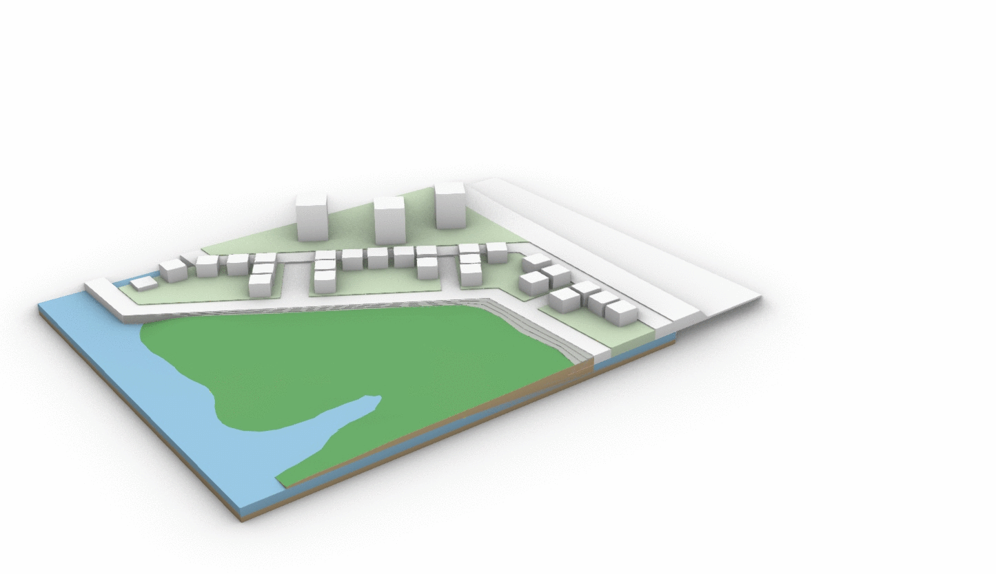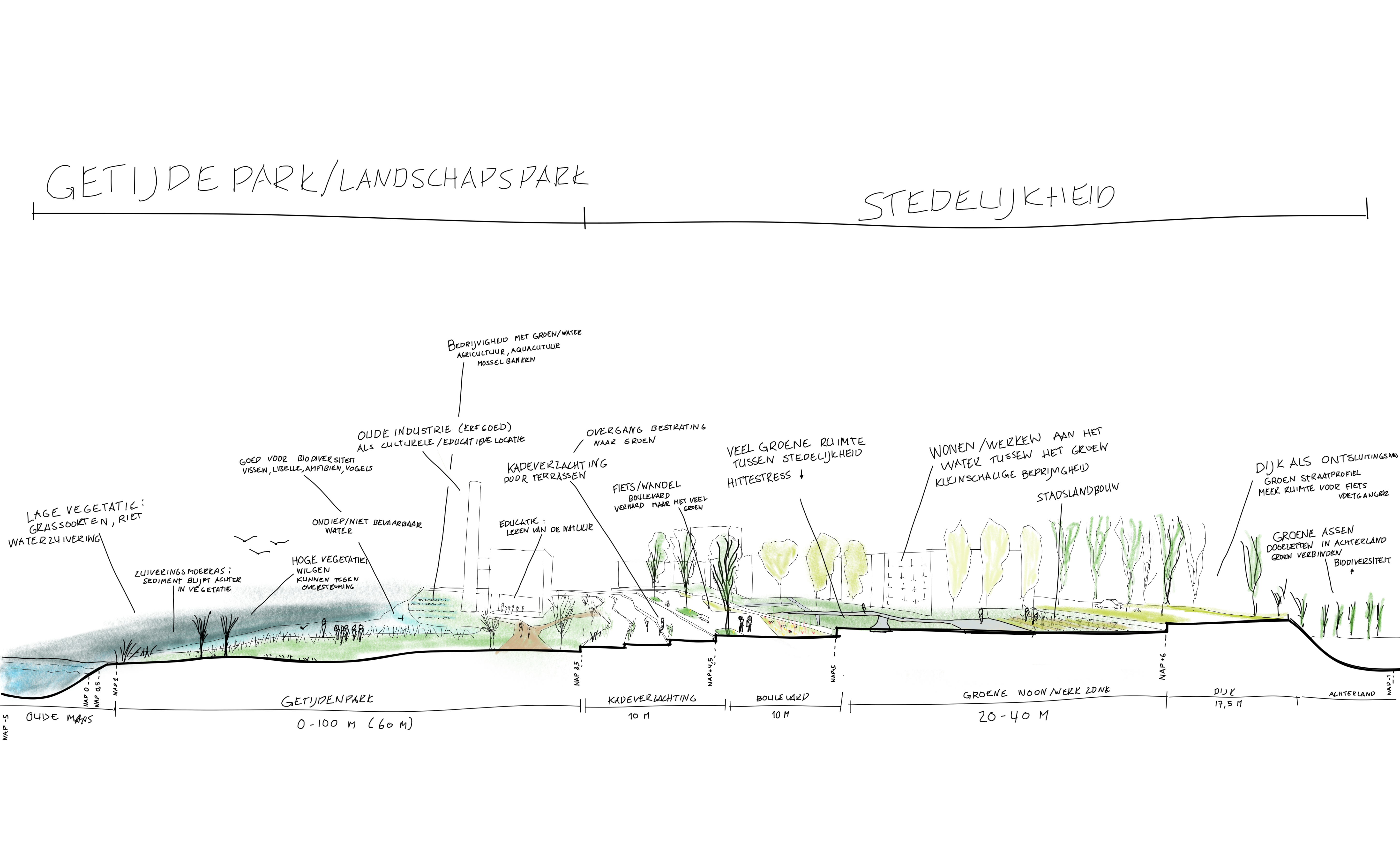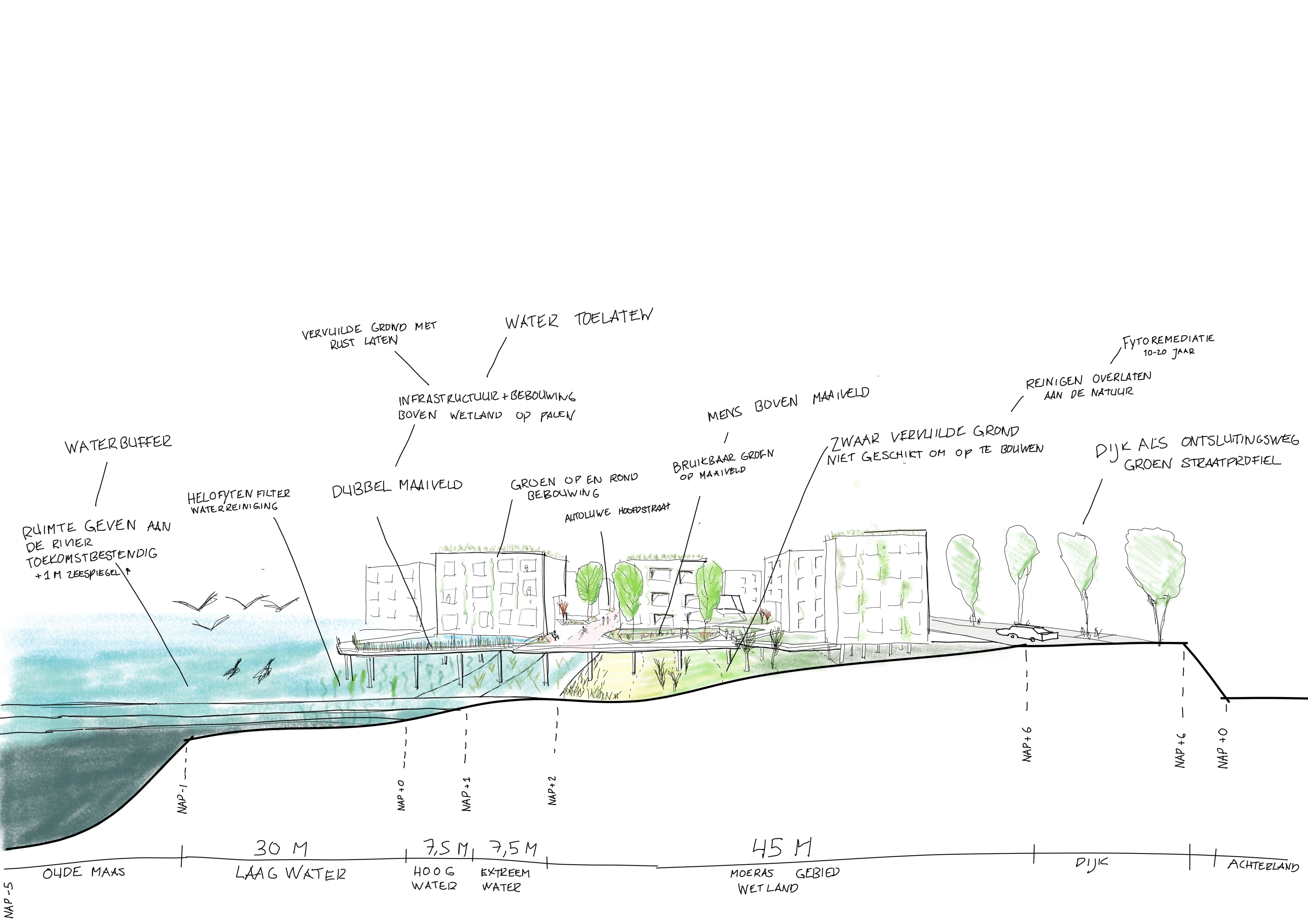 Because of the complex located near the river, I focussed as landscape architect mainly on the problem of an unattractive and potentially dangerous riverfront. We tried to make this waterfront more resilient by softening the dikes and making more room for the river. together with the urban planner, I designed a housing typology that doesn’t fight against the water but a situated on top of the water, leaving room for nature and water.
