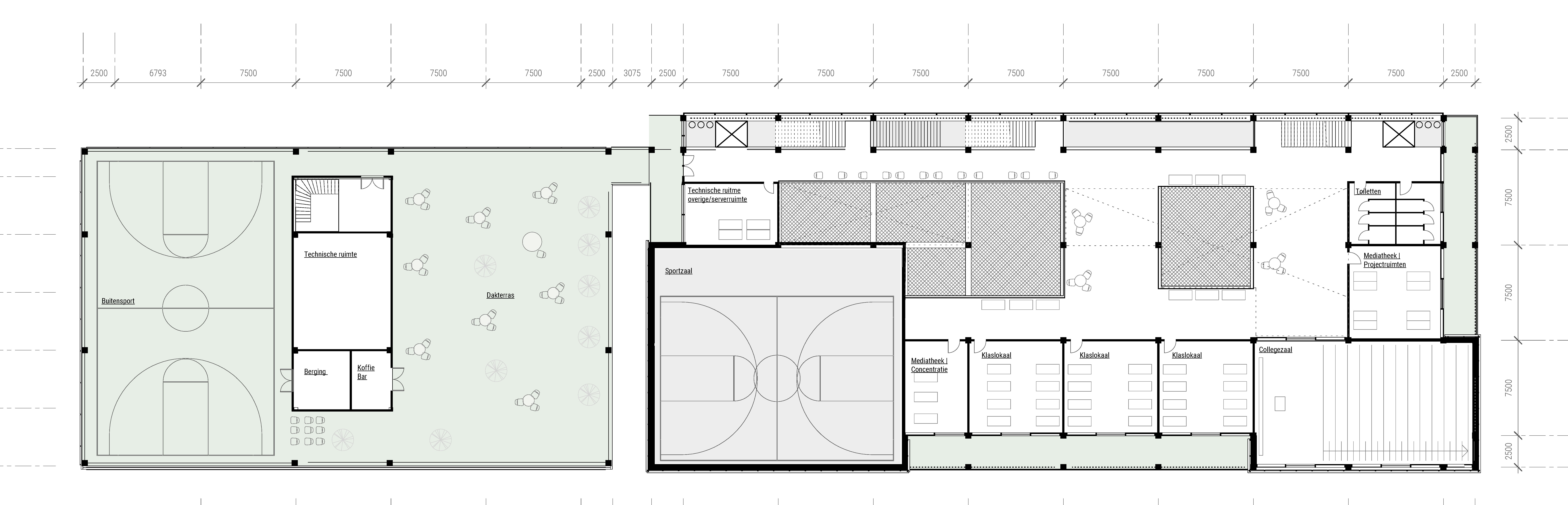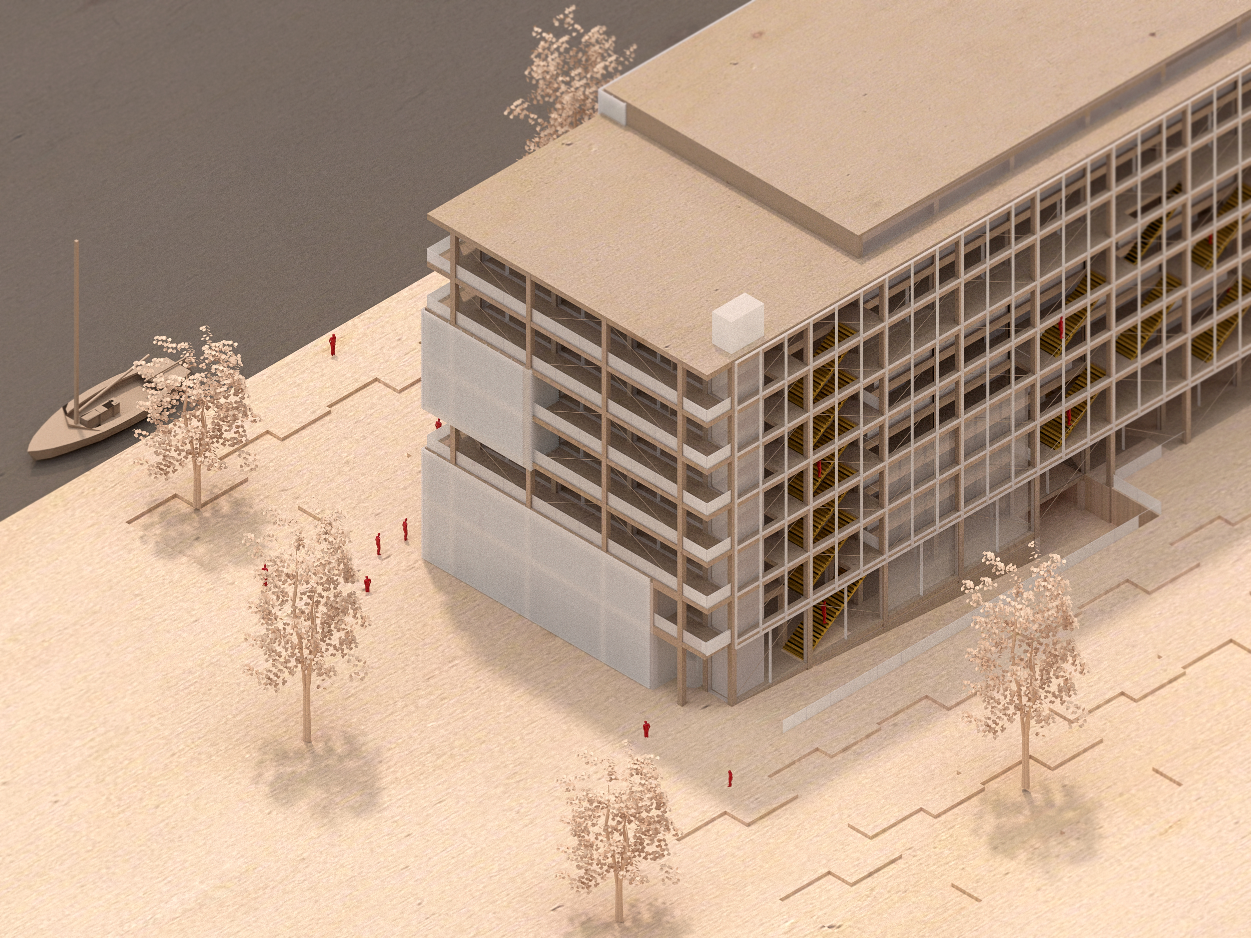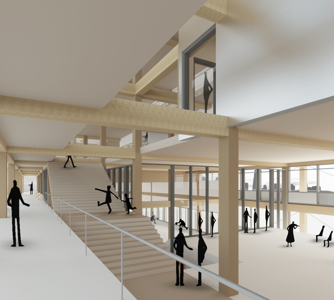 During this final bachelor design project, we were asked to design a sports campus in an old harbor area in Rotterdam. Because of the diverse program (education/sports), I came up with a vision to distribute this diverse program throughout the building; Stacking the large volumes (sports courts) on top off each other with the remaining and multipurpose program in between. With these conditions, I tried to create a ’microcity’ in the building, with ’streets’ and ’squares’ open for different purposes. Visually connecting all these areas by creating voids and a vertical transportation zone in the north facade. Most important in this design project was the integral design of architecture, structure and climate design. Therefore I tried to construct the whole building with laminated timber. And thereby creating a old school sports vibe in the interior.