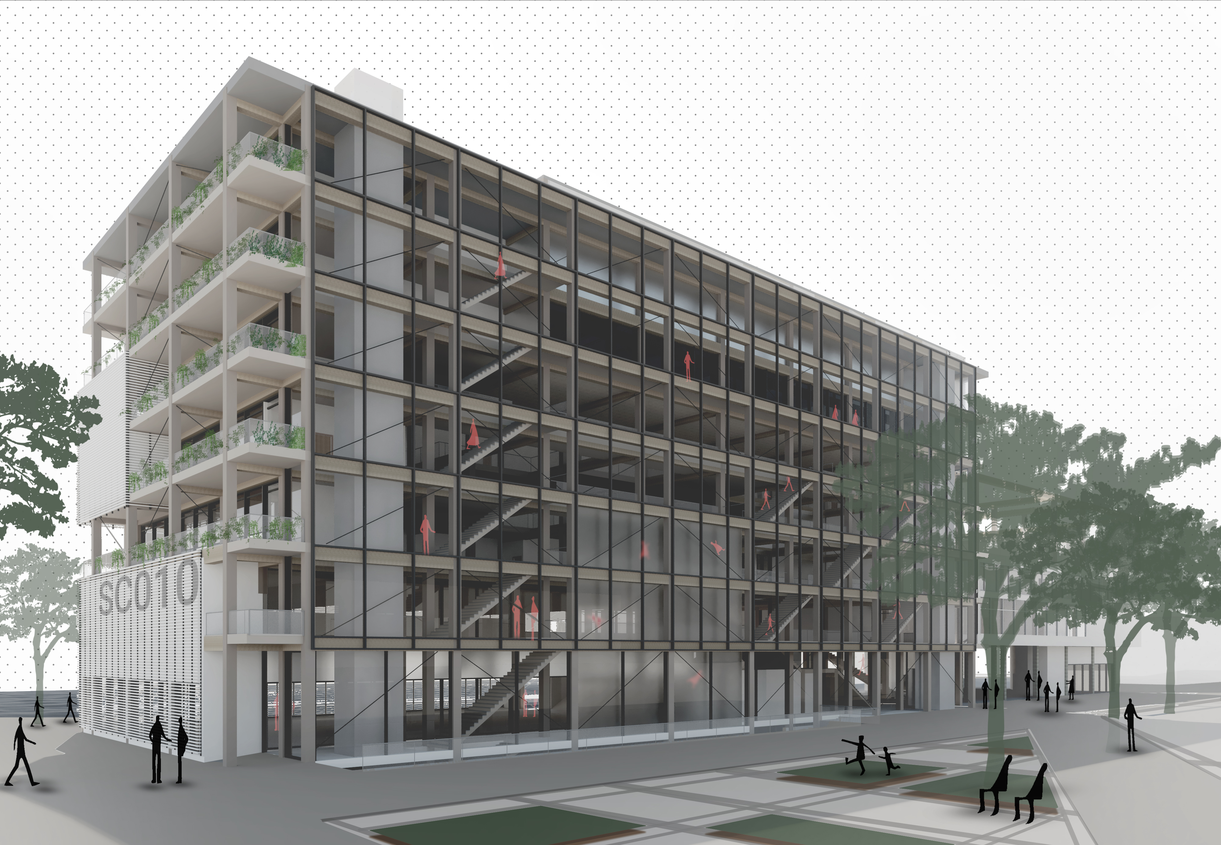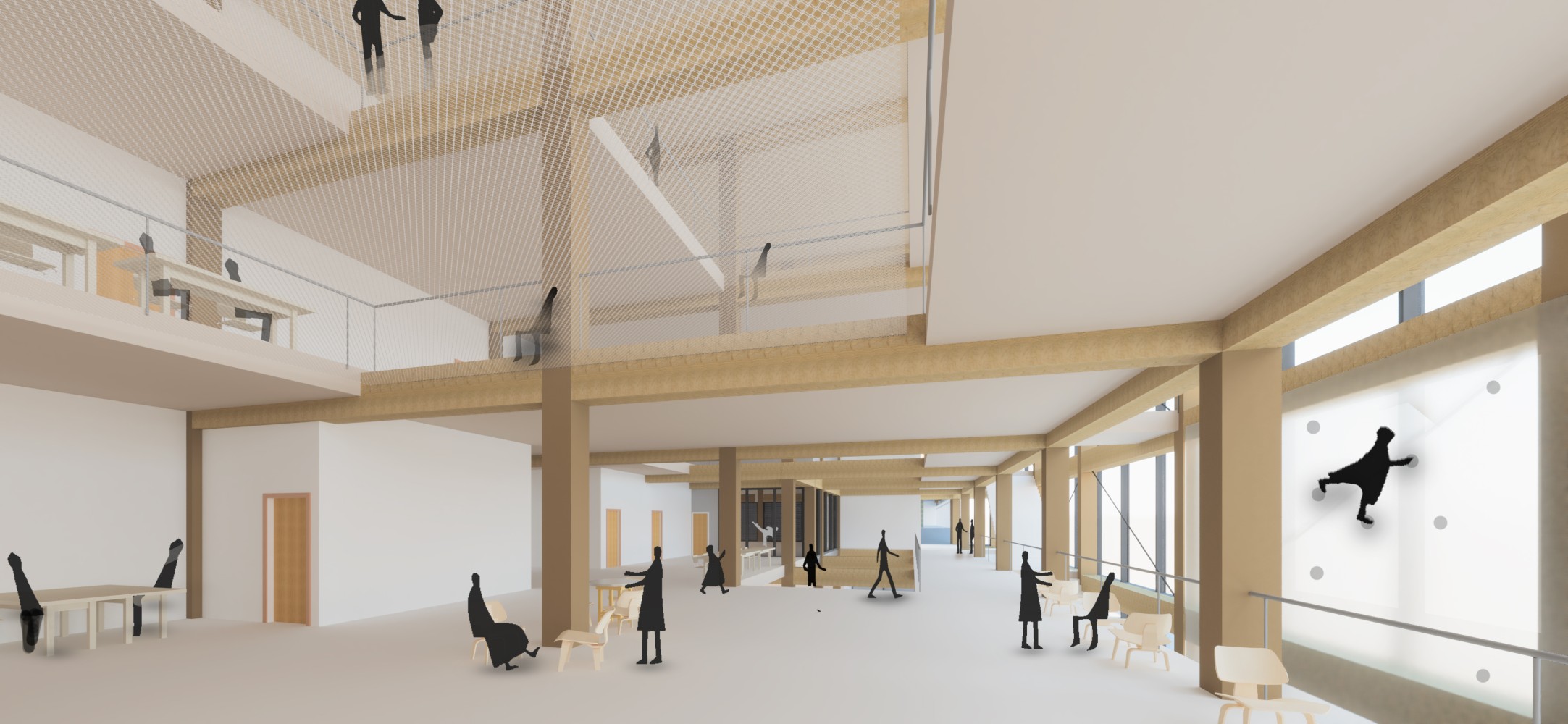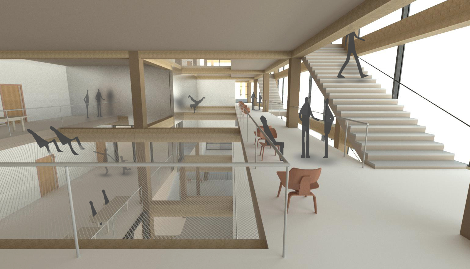 During this final bachelor design project, we were asked to design a sports campus in an old harbor area in Rotterdam. Because of the diverse program (education/sports), I came up with a vision to distribute this diverse program throughout the building; Stacking the large volumes (sports courts) on top off each other with the remaining and multipurpose program in between. With these conditions, I tried to create a ’microcity’ in the building, with ’streets’ and ’squares’ open for different purposes. Visually connecting all these areas by creating voids and a vertical transportation zone in the north facade. Most important in this design project was the integral design of architecture, structure and climate design. Therefore I tried to construct the whole building with laminated timber. And thereby creating a old school sports vibe in the interior.